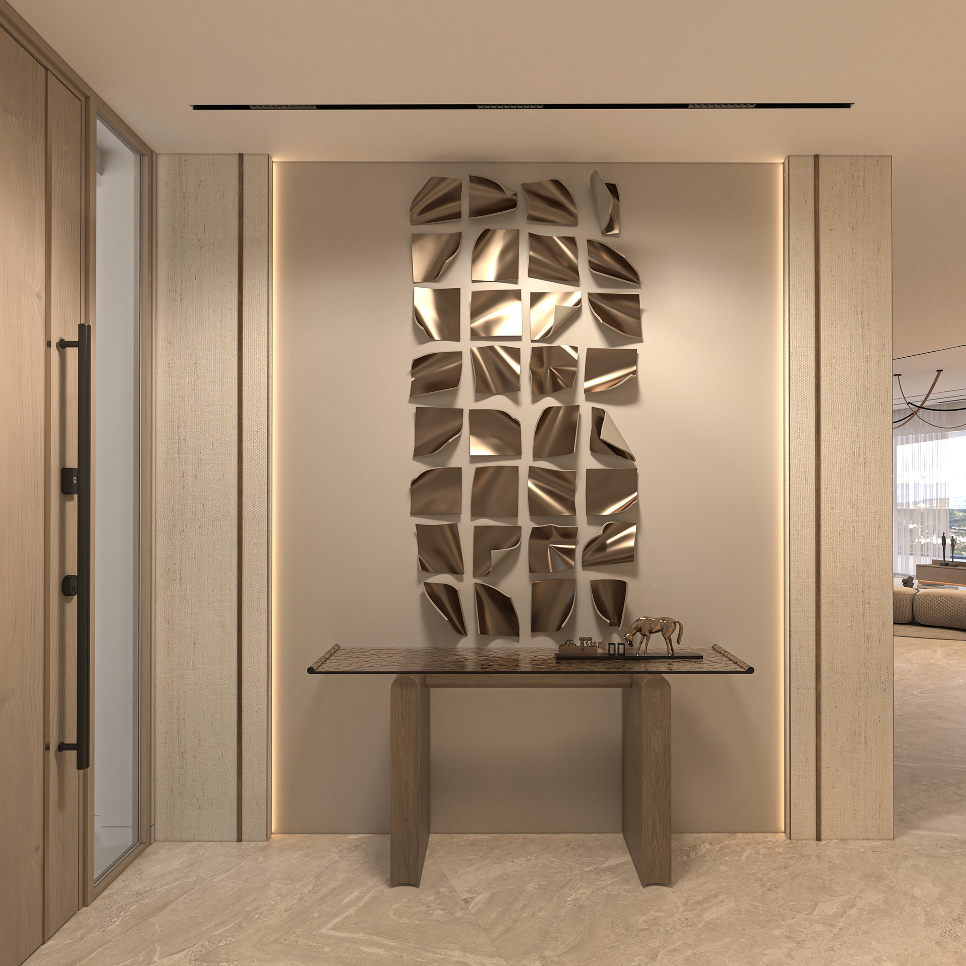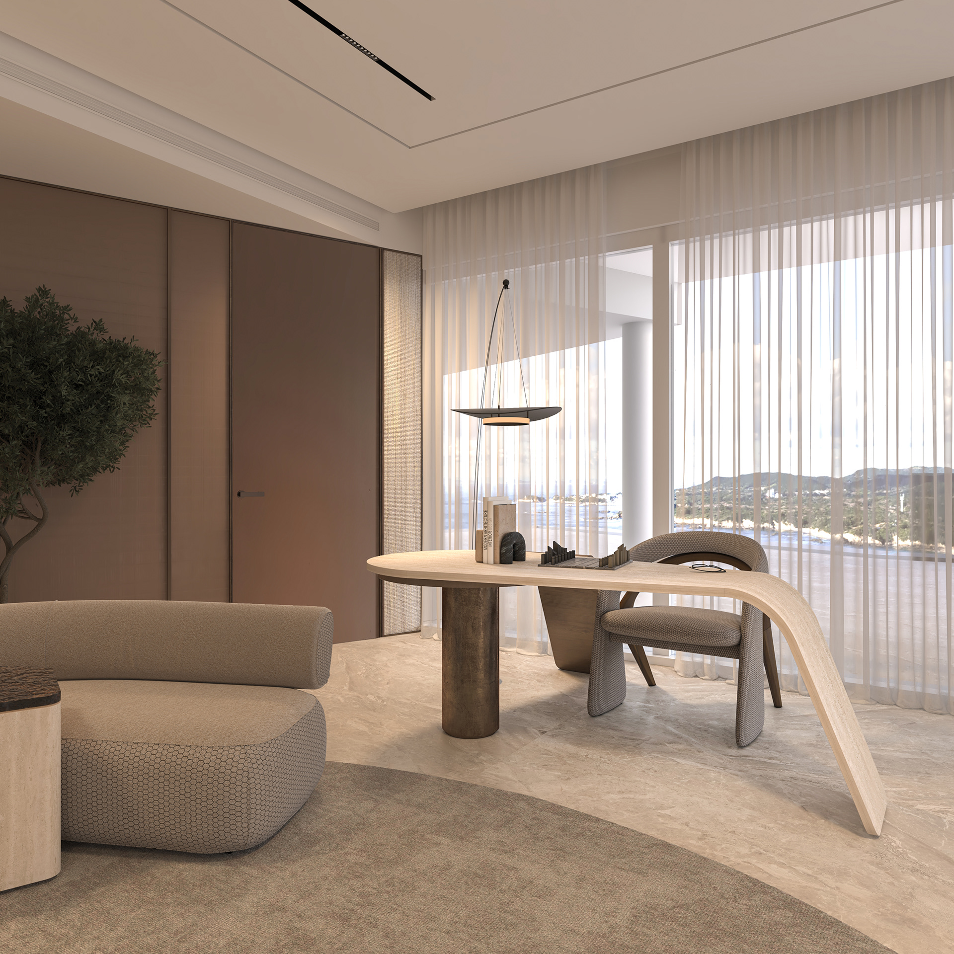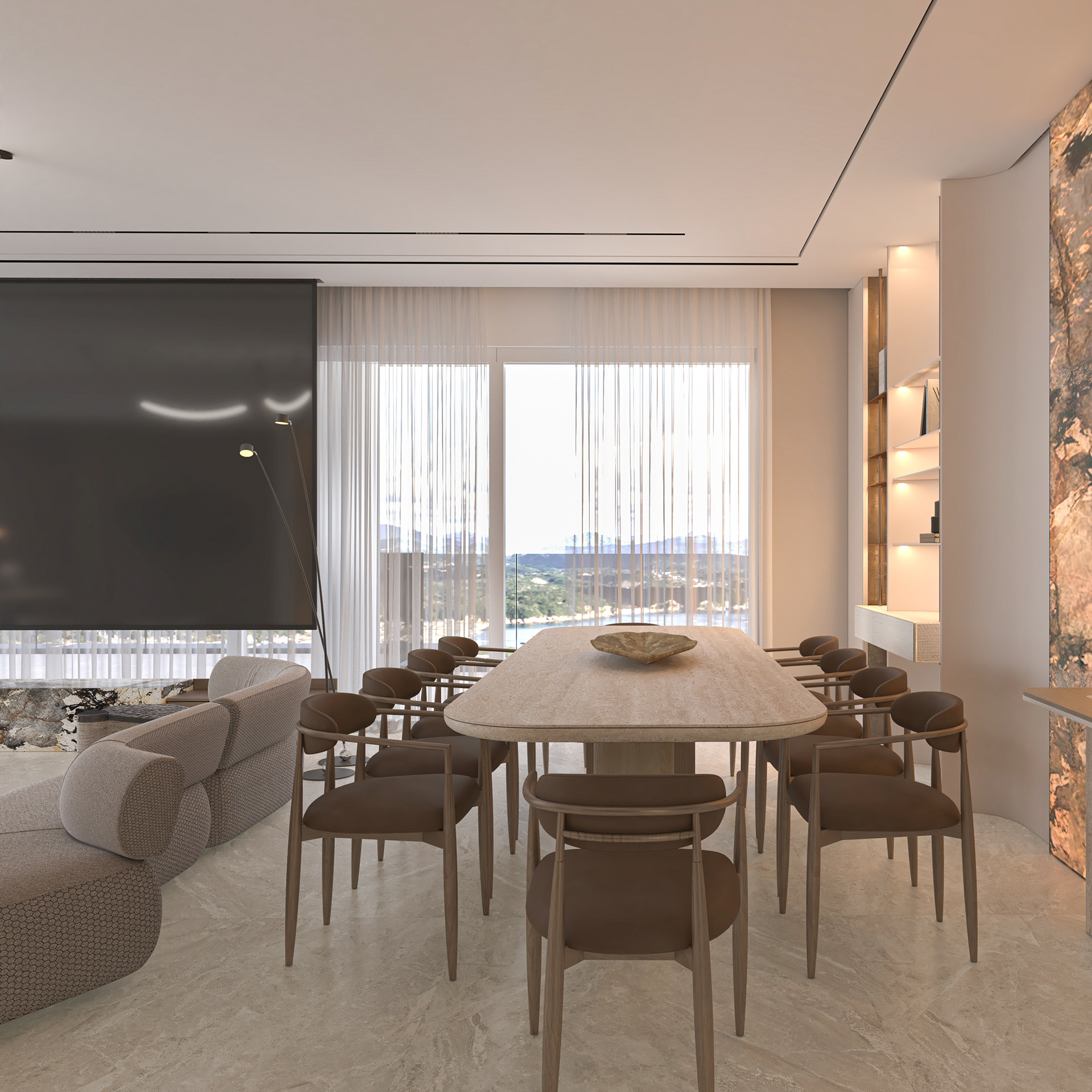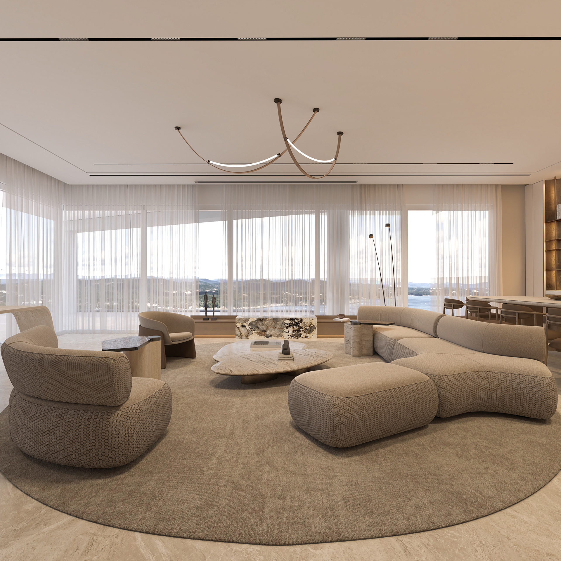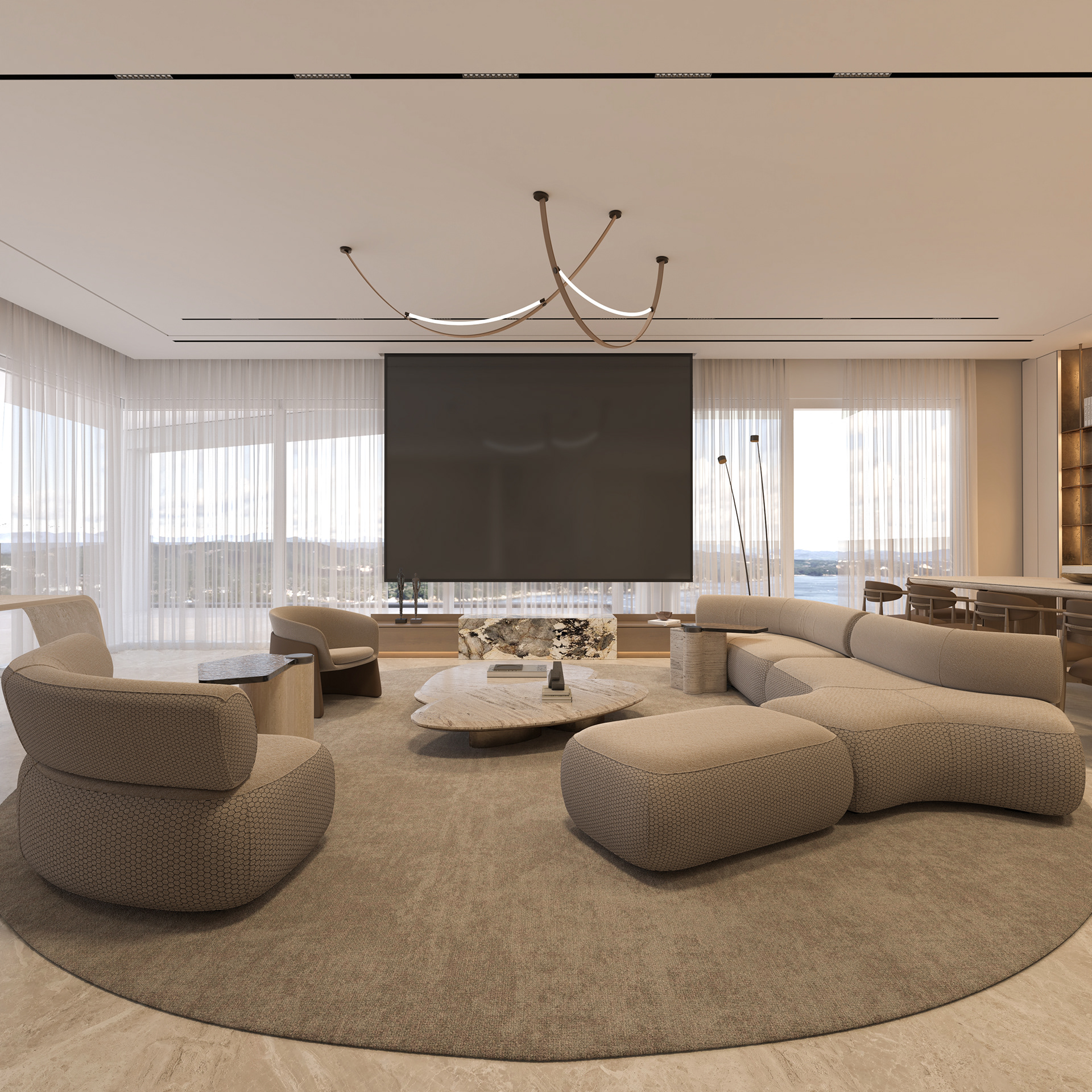 Solving complex spatial challenges was the core of this Palm Jumeirah Penthouse redesign. My focus was on transforming the living area and master suite into a refined, minimalist space by stripping away heavy wall claddings to reveal a clean, airy aesthetic. To maintain this simplicity while meeting the client's needs, I integrated three smart solutions: a hidden TV system, a flexible kitchen that opens or closes for privacy, and a discreet home office that blends seamlessly into the living room without cluttering the design. The result is a sophisticated home where high-end functionality and modern elegance perfectly coexist.