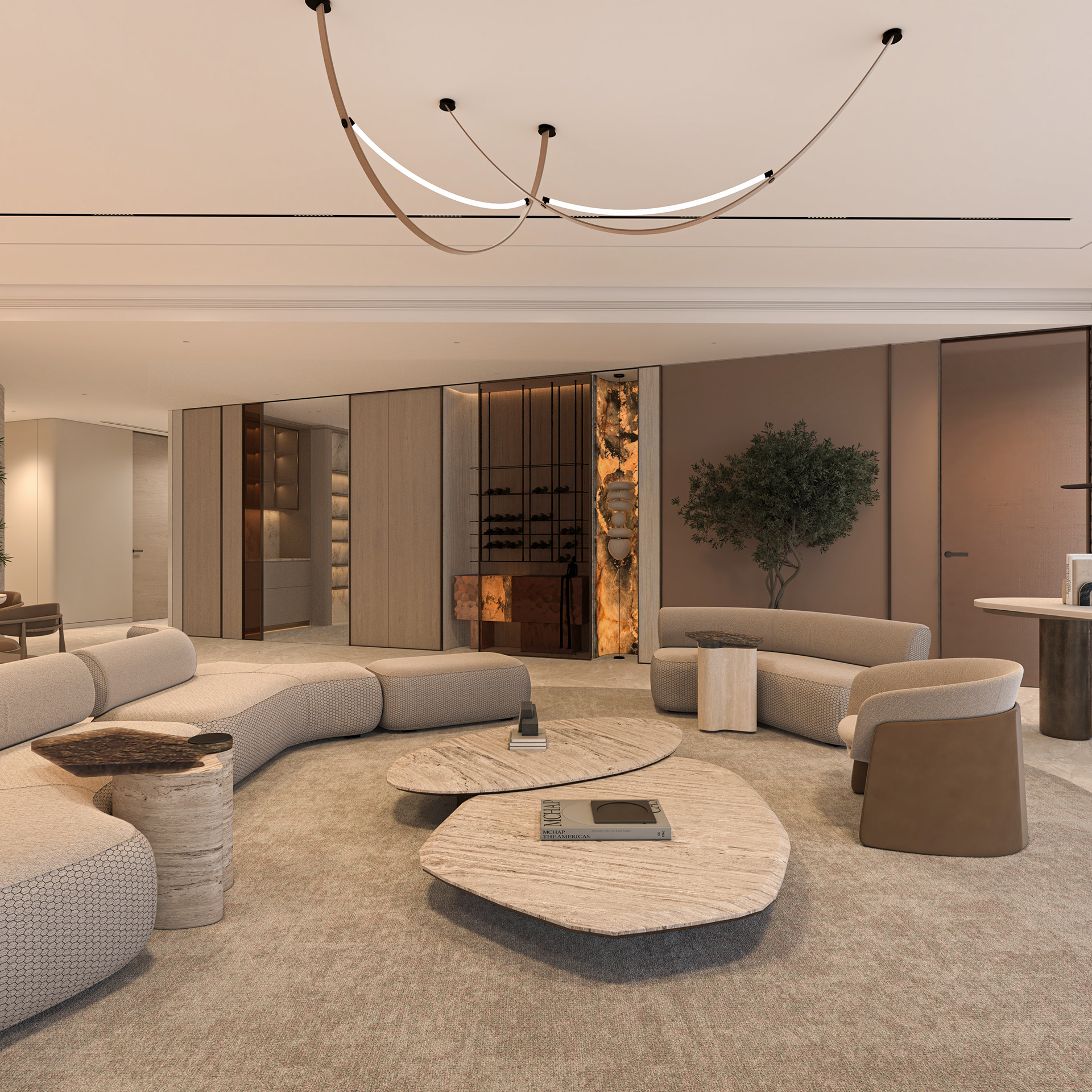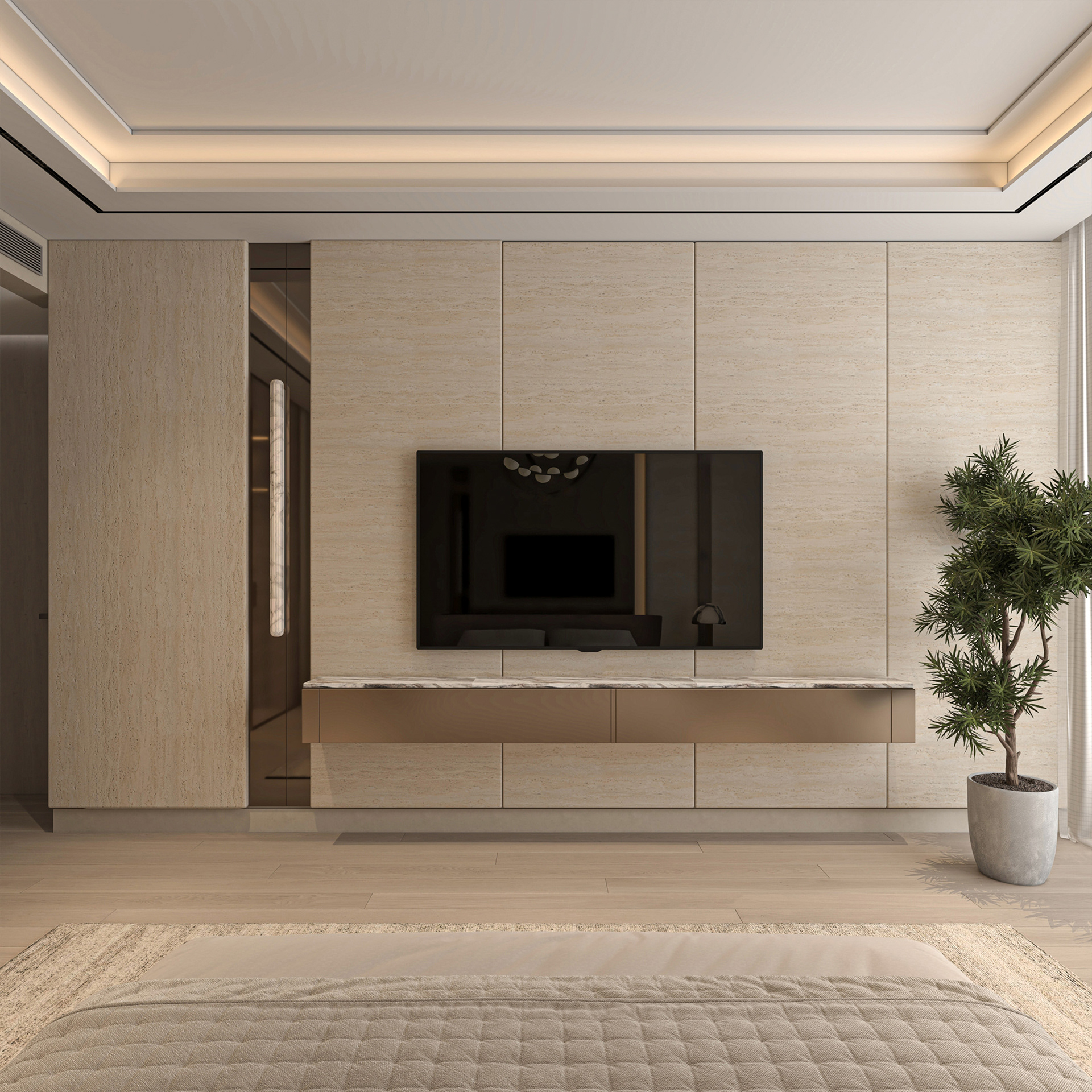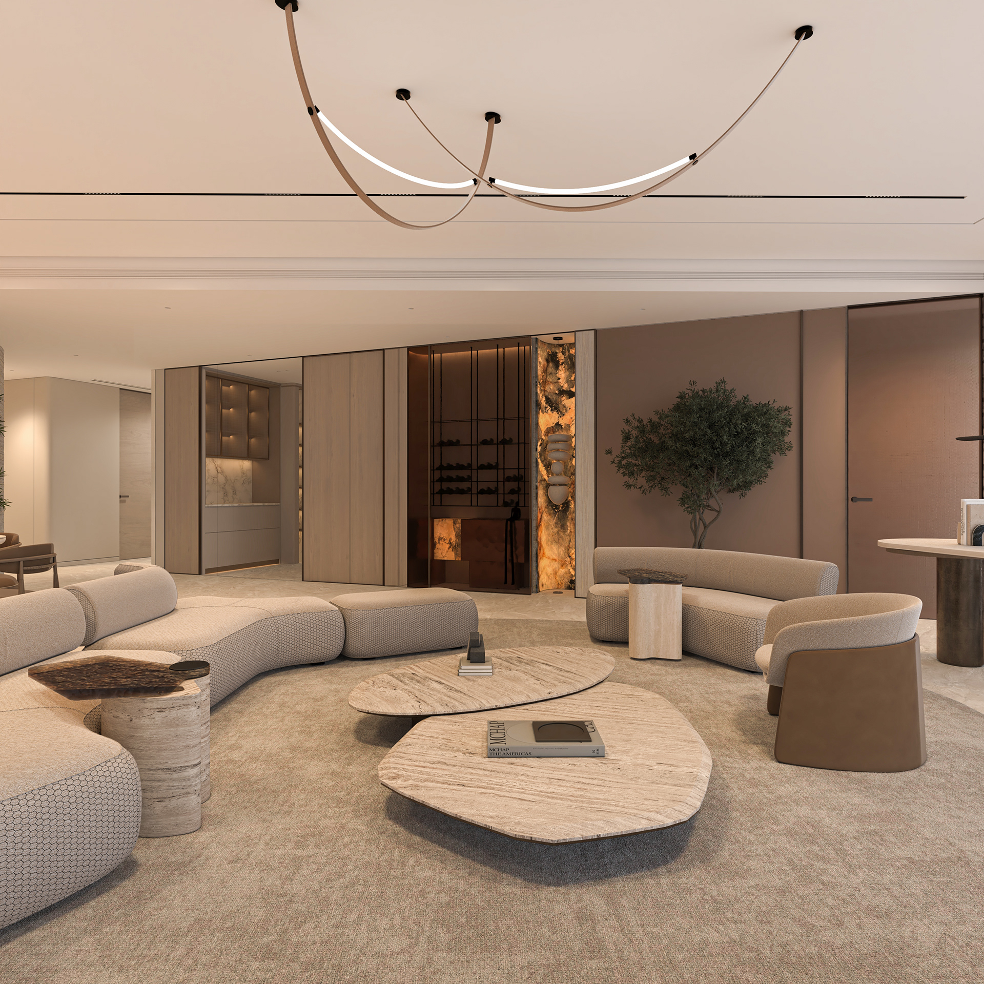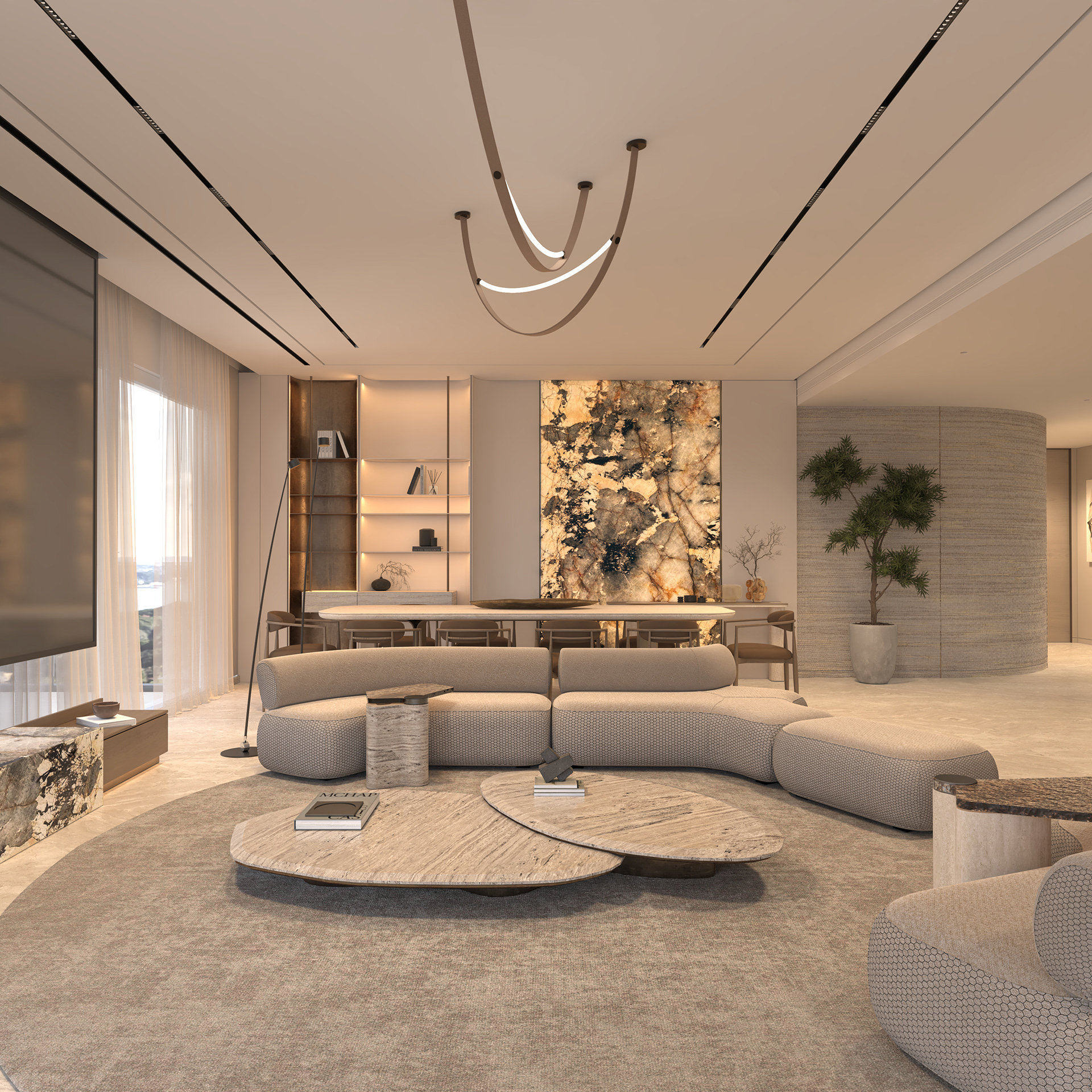 Solving complex spatial challenges was the core of this Palm Jumeirah Penthouse redesign. My focus was on transforming the living area and master suite into a refined, minimalist space by stripping away heavy wall claddings to reveal a clean, airy aesthetic. To maintain this simplicity while meeting the client's needs, I integrated three smart solutions: a hidden TV system, a flexible kitchen that opens or closes for privacy, and a discreet home office that blends seamlessly into the living room without cluttering the design. The result is a sophisticated home where high-end functionality and modern elegance perfectly coexist.