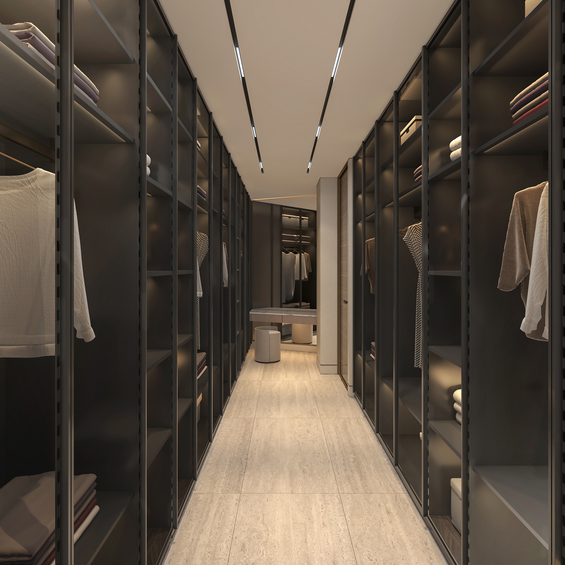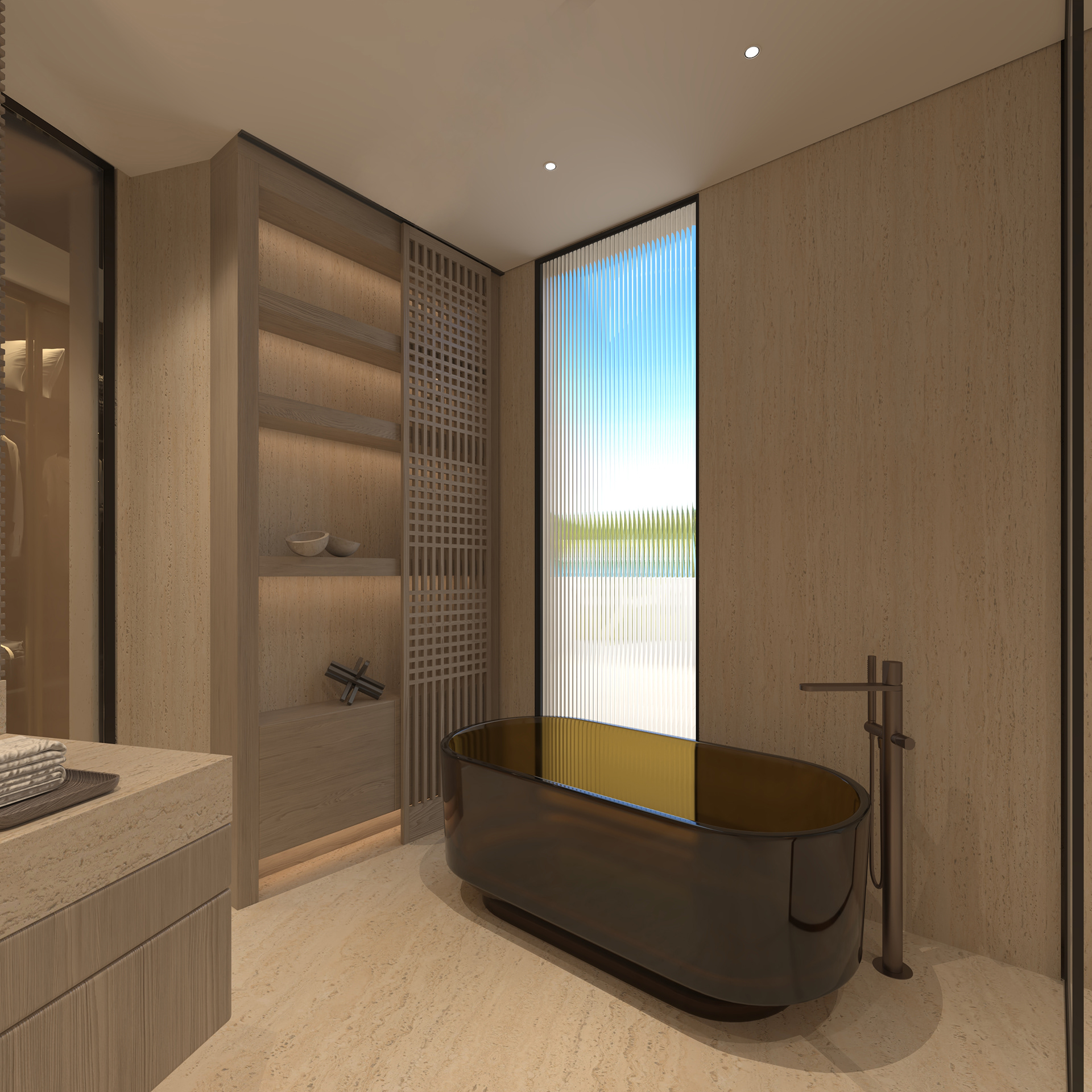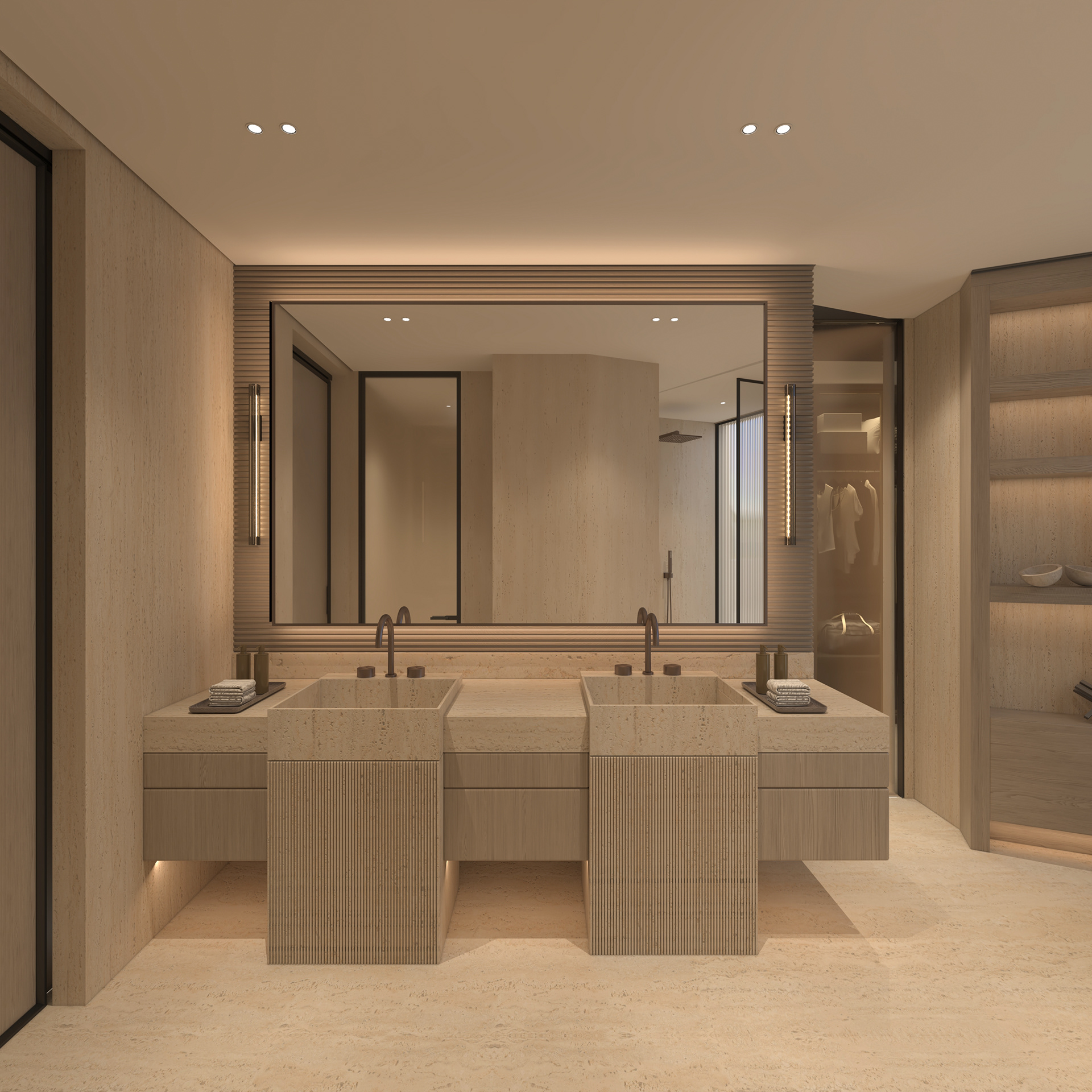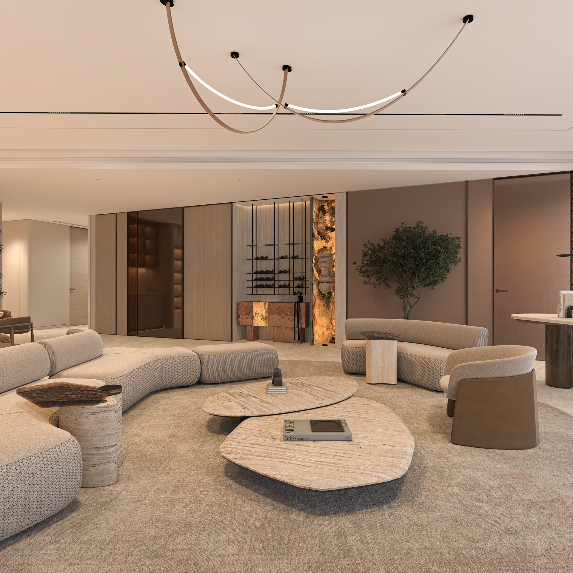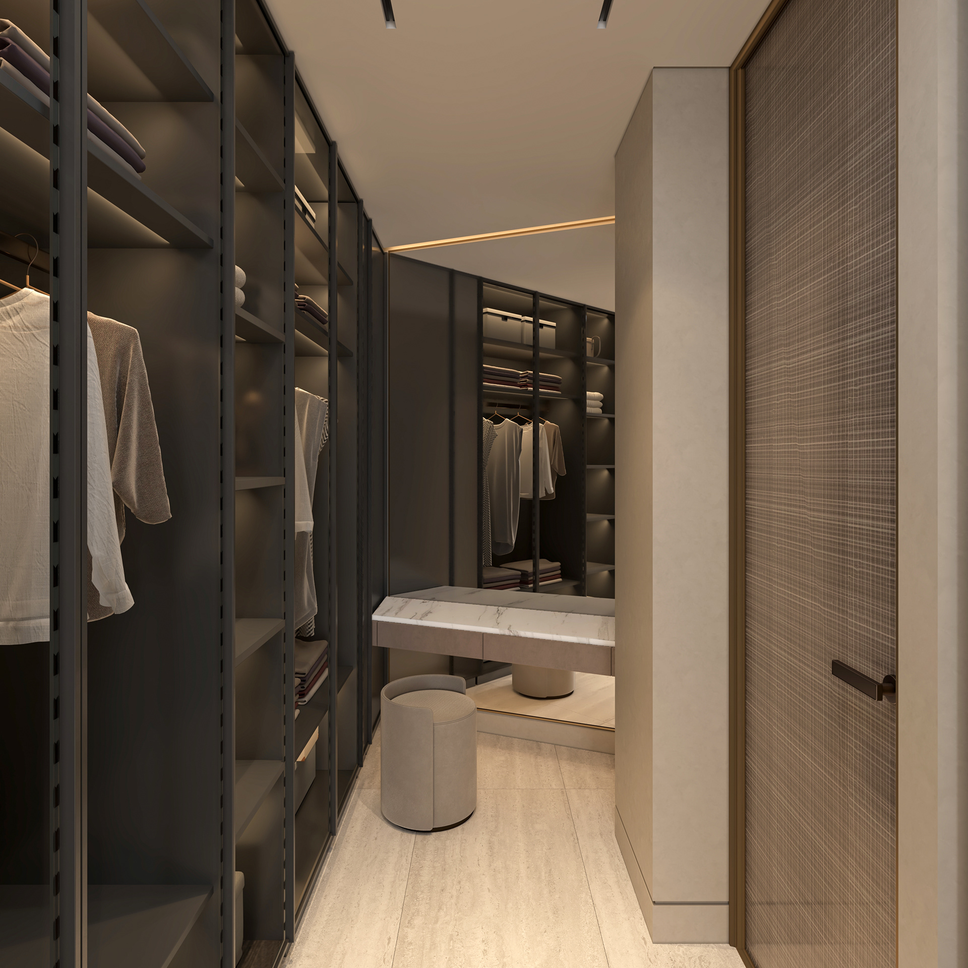 Solving complex spatial challenges was the core of this Palm Jumeirah Penthouse redesign. My focus was on transforming the living area and master suite into a refined, minimalist space by stripping away heavy wall claddings to reveal a clean, airy aesthetic. To maintain this simplicity while meeting the client's needs, I integrated three smart solutions: a hidden TV system, a flexible kitchen that opens or closes for privacy, and a discreet home office that blends seamlessly into the living room without cluttering the design. The result is a sophisticated home where high-end functionality and modern elegance perfectly coexist.